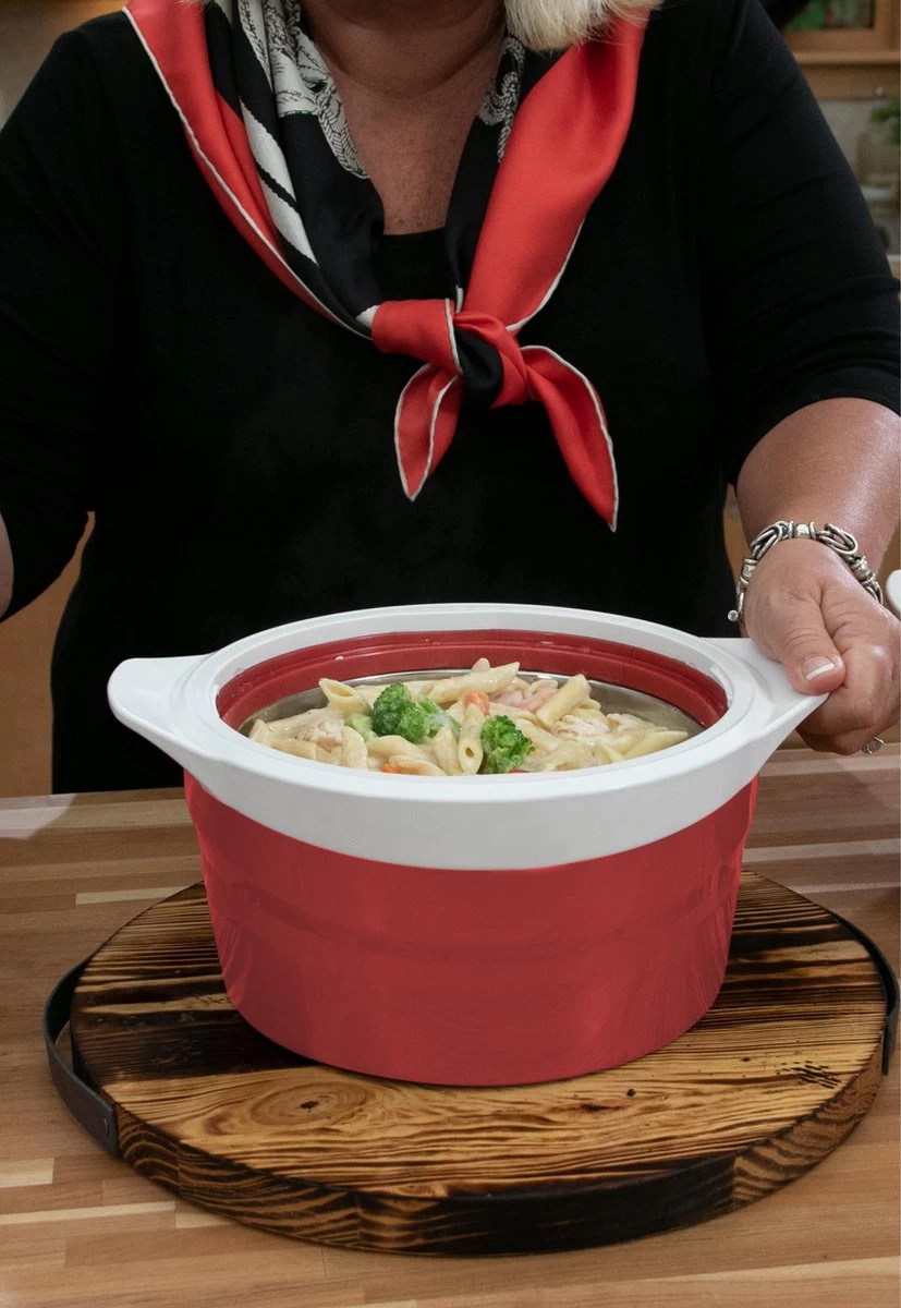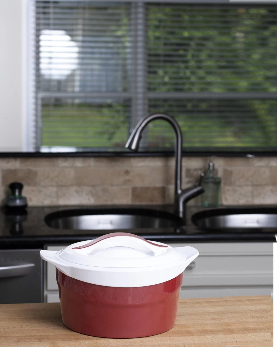 Het is een onmisbare bewaarkom voor picknicks, bbq’s, en elke andere vorm van samenzijn. De maaltijd die je namelijk mee wil nemen blijft dankzij de dubbele roestvrijstalen binnenkant altijd op de juiste temperatuur. Bovendien houdt de vergrendelingsdeksel de maaltijd veilig in de kom, ook al hij per ongeluk omvalt tijdens het vervoeren. Ook heeft de kom twee handvatten en een koele buitenkant, zelfs met warm eten erin. Dus waar je ook bent, jouw maaltijd heeft altijd de juiste temperatuur!