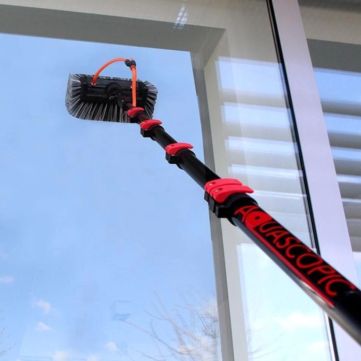 Telescoopsteel nodig? Met deze Aquascopic set maak je professioneel hoge ramen, zonnepanelen en daken schoon. Nooit meer op een gevaarlijke hoogte werken! Schoonmaken met of zonder water op 5,4 meter hoogte is geen probleem voor de Aquascopic.
