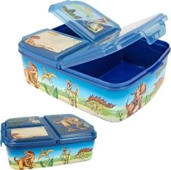 De blauwe broodtrommel van Dino World heeft supercoole dino afbeeldingen, een grappige tekst en een vlak om helemaal eigen te maken met een watervaste stift (niet bijgesloten). De drie aparte vakken hebben een handige kliksluiting. V
