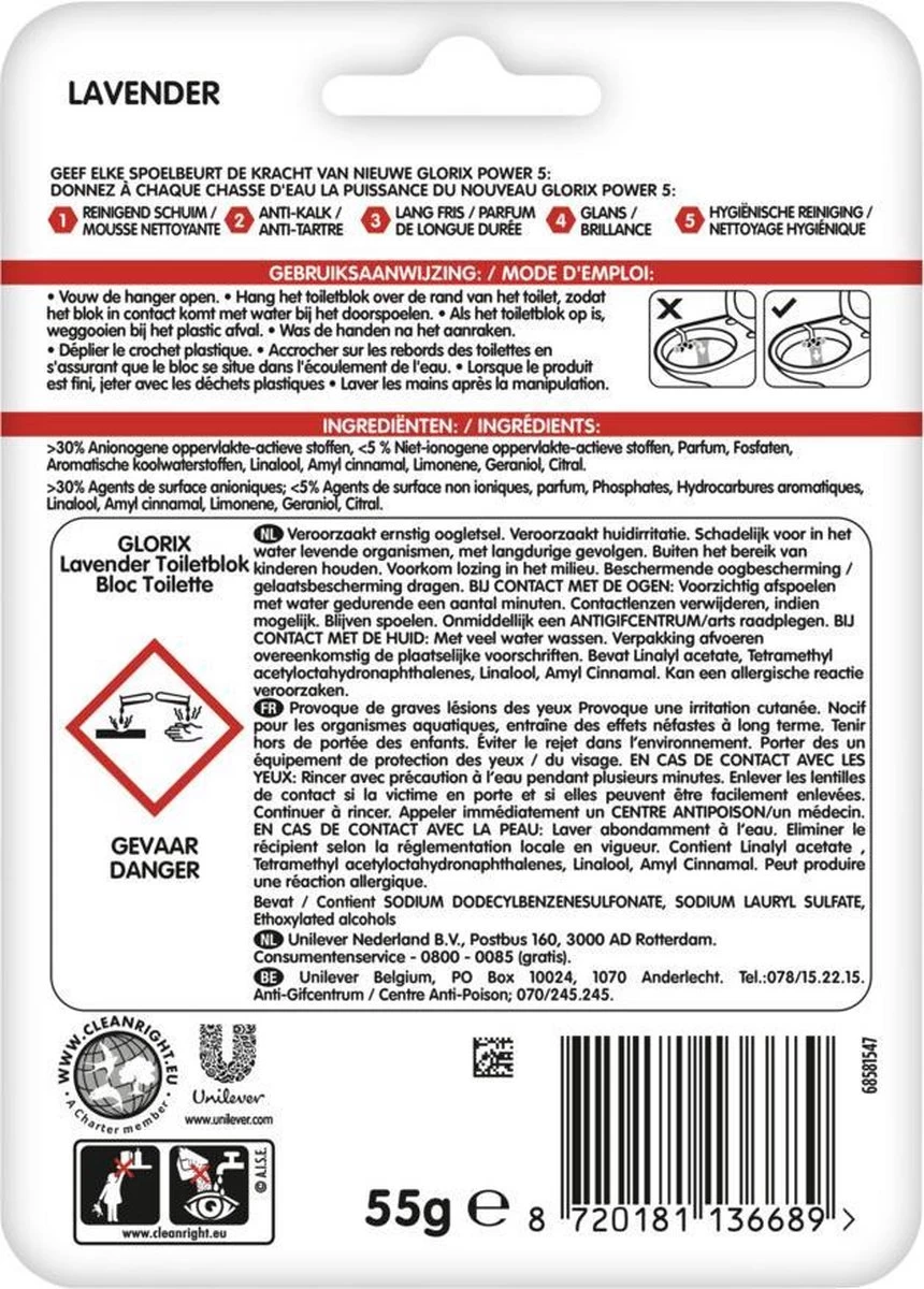 Het Glorix Lavendel WC blok geeft elke spoelbeurt de kracht van Glorix Power 5, tot wel 300 spoelbeurten lang. Het product heeft diverse voordelen! Het reinigend schuim met anti-kalk werking houdt je toilet lang fris en zorgt bovendien voor glans en een hygiënische reiniging. Zo geniet jij dagelijks van een schoon toilet. De hanger is bovendien 100% recyclebaar! Gebruiksaanwijzing: – Vouw de hanger open. – Hang het toiletblok over de rand van het toilet, zodat het blok in contact komt met water bij het doorspoelen. – Als het toiletblok op is, weggooien in de vuilnisbak. – Was de handen na het aanraken.