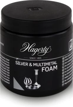 Hagety Silver & Multimetal Foam is een veelzijdigend reinigingsproduct voor tin, roestvrij staal, zilver en verzilverde sieraden, schalen en fotolijsten. Het schuimende foam is een snelwerkend en niet-schurend poetsmiddel, dat eenvoudig en snel aanslag verwijdert. De pasta bevat zeep en oplosmiddelen van plantaardige oorsprong en veroorzaakt geen krassen op het metaal. Uw zilverwerk wordt weer schoon en glanzend. Dit product is bijzonder geschikt voor grotere items zoals dienbladen en zilveren schalen.