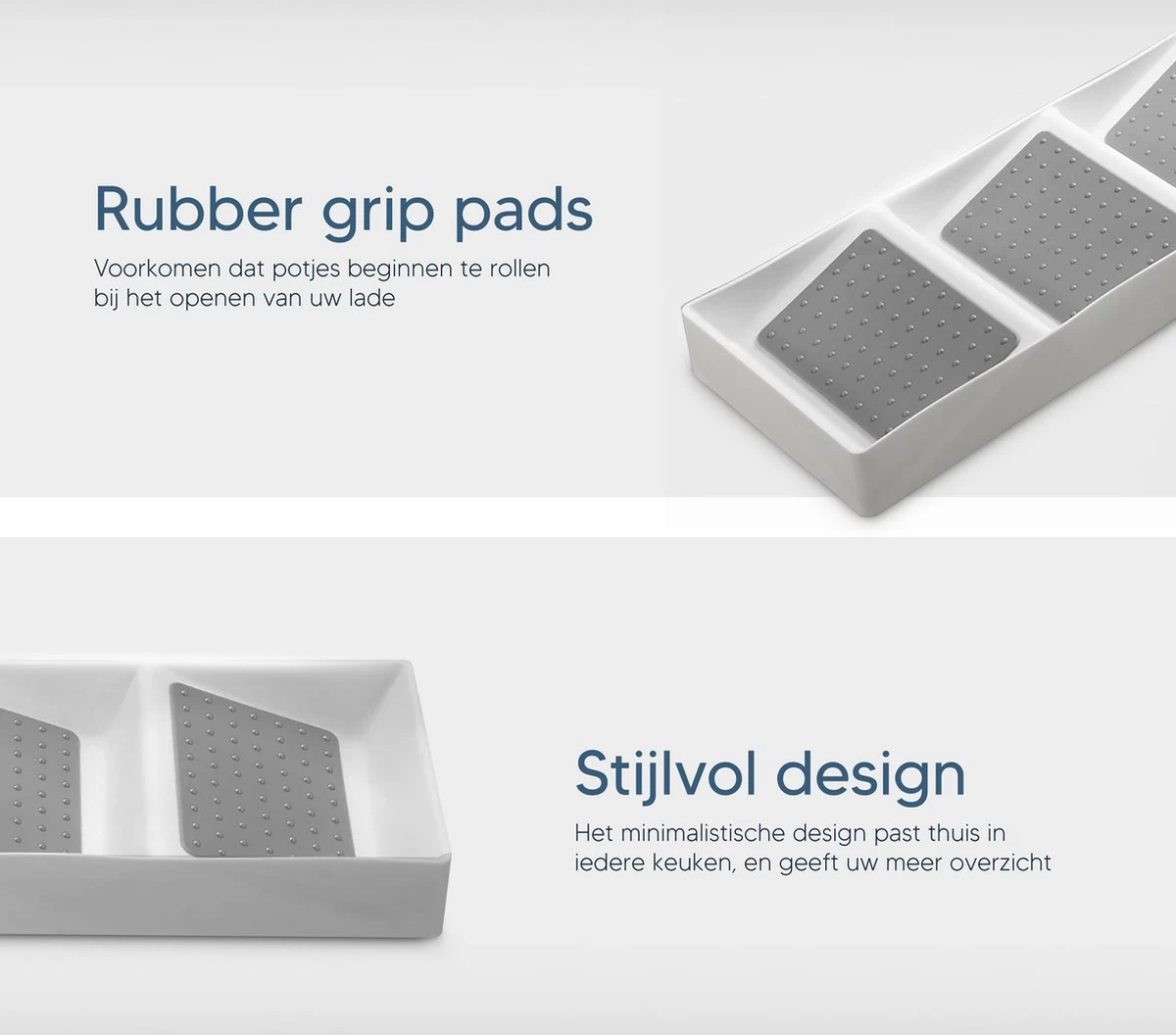Meer opbergruimte: De keuken organiser zorgt voor orde in de kasten en lades van je keuken. De lade-indeling kan zonder boren geplaatst worden.