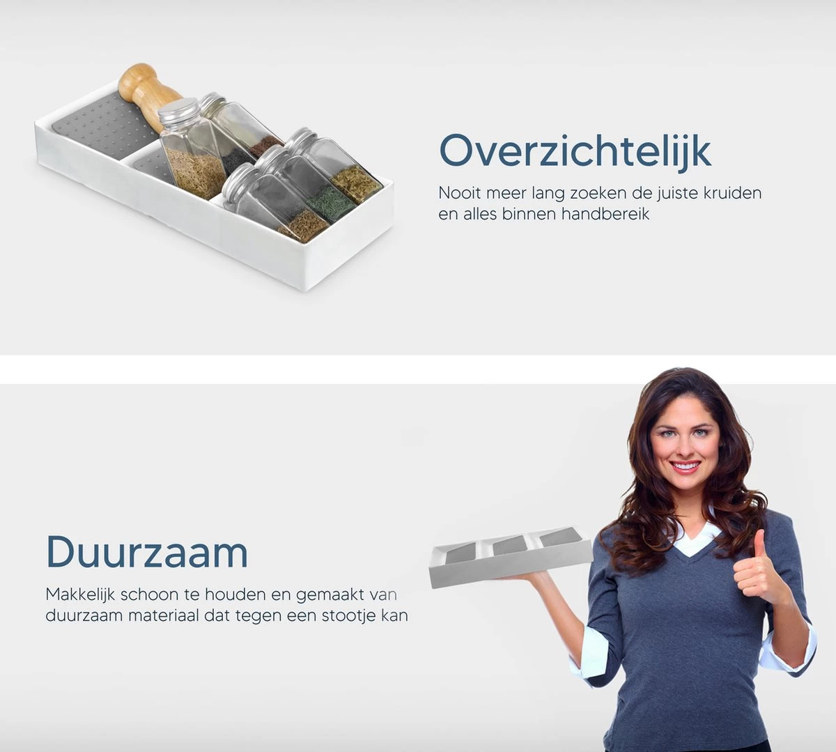 We kennen het allemaal, je kruidenpotjes ergens opbergen waar ze niet in de weg liggen. Maar zodra je ze nodig hebt is het vaak een heel gedoe om de juiste te vinden. Je probeert ze zo overzichtelijk mogelijk neer te zetten, maar toch moet je steeds alles op tillen om de juiste te vinden. Die tijd is voorbij! Met deze handige organiser liggen als je kruidenpotjes netjes op een rijtje en binnen handbereik.