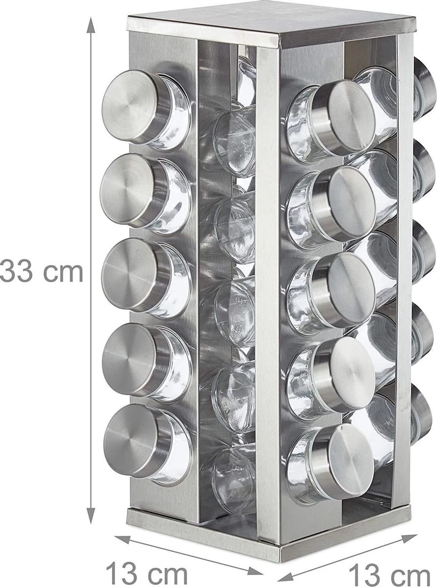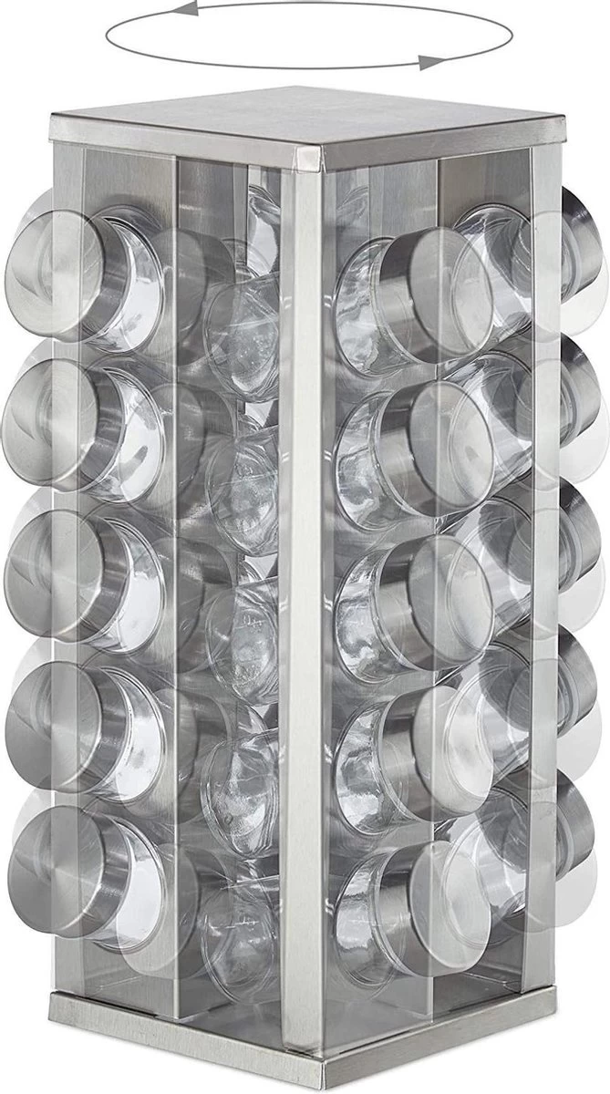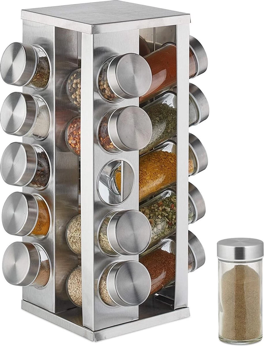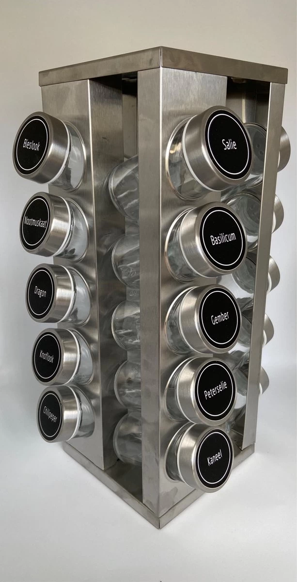 Draaibaar kruidenrek inclusief 20 potjes voor een scherpe prijs. Pleasantwork biedt een stevig kruidenrek aan met een strak design, gemaakt van RVS. Dit zorgt ervoor dat het product sterk en goed te onderhouden is. Op de tafel, in de keuken, overal kan het neergezet worden. Door het soepele draaien van het rek is het gemakkelijk om van elke kant een potje te pakken of terug te plaatsen. Naast het rek en de potjes is er een vel stickers toegevoegd met 24 verschillende kruidennamen die u op de deksel van het potje kunt plakken. Zo is het overzichtelijk welke kruiden waar in het rek staan.