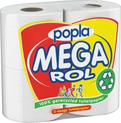 Popla megarol is zacht en sterk toiletpapier en is gemaakt van 100% hoogwaardig kringlooppapier. Het is goed afbreekbaar in het toilet. De verpakking is PVC vrij en recyclebaar. Popla heeft mega veel vellen op een rol en gaat dus extra lang mee! Op zoek naar de juiste prijs/kwaliteit? Probeer Popla.