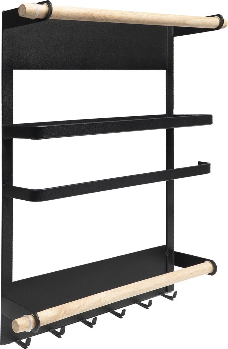 Het keukenrek in het zwart met magneetstrip is 35 cm hoog, 28.5 cm breed en 7,5 cm diep. Het plateau waar potjes opgezet kunnen worden meet 5,5 x 24 cm (lxb). Hij past daardoor op (bijna) elke koelkast,maar is natuurlijk ook te bevestigen aan alle magnetische oppervlakten. Bovenaan het rekje is een houten stang om wat aan te hangen of bijvoorbeeld een bord achter te zetten. Dat bord kan dan ondersteund worden door het metalen plankje eronder. Onder het plankje bevind zich een metalen stang,met een opening aan de zijkant. Vervolgens is er weer een houten stang. Helemaal onderaan zijn ook nog een aantal metalen haakjes te vinden,hier kunnen handdoeken aan opgehangen worden.