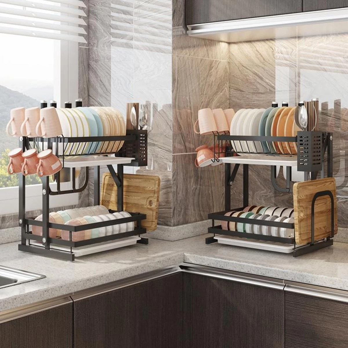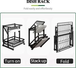 De compacte afdruiprek is gemaakt van hoge kwaliteit, roestvrij staal en antikras materiaal. Frame, antislip en de connectors zorgen voor een solide ondersteuning, zodat de rek soepel beweegt en stabiel staat. - GEEN INSTALLATIE NODIG