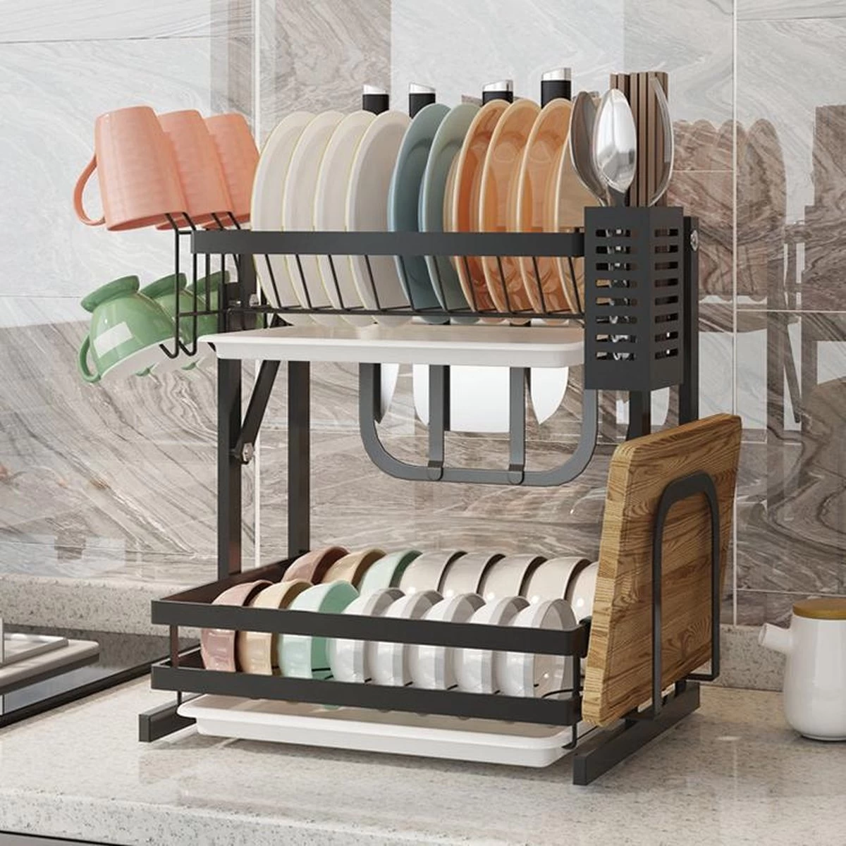 De 2 laags afdruiprek heeft de afmeting van 35×26,5x38CM. Er passen tot 10 borden boven, 16 kommen beneden. Ons afdruiprek wordt geleverd met: