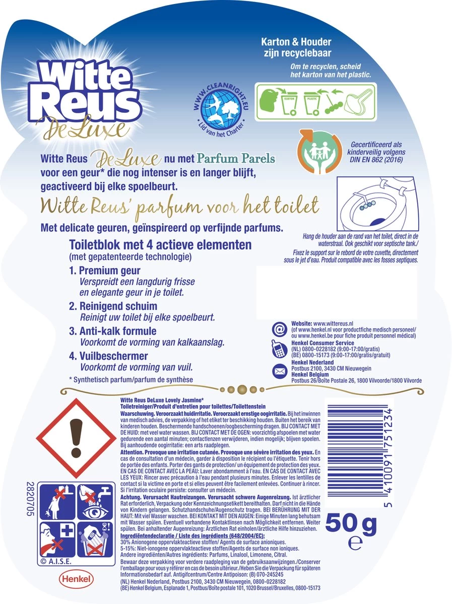 Vind jij ook dat je toilet een unieke en luxe geur verdient? Witte Reus De Luxe Lovely Jasmine is het eerste toiletblok met parfum die uw toilet een elegante en premium geur geeft. De geur is geïnspireerd door verfijnde parfums, maar het product geeft je ook de vertrouwde Witte Reus frisheid.